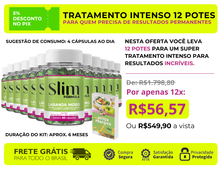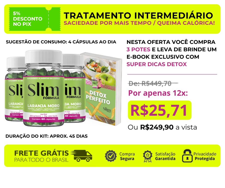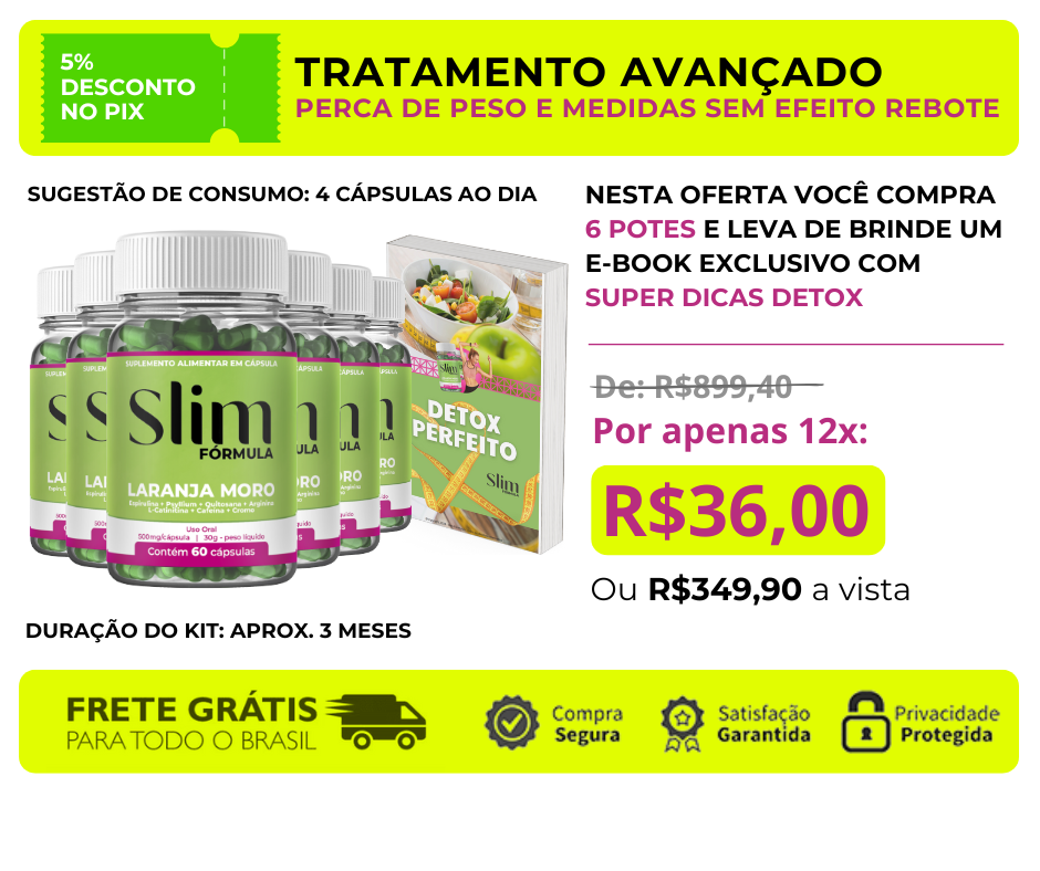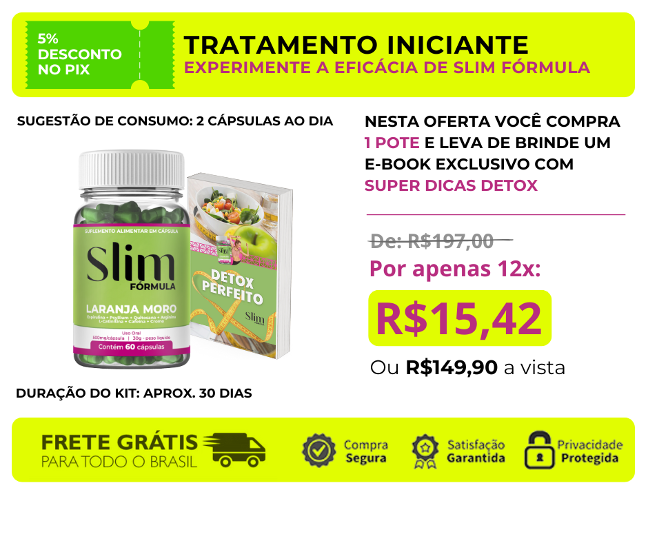 Slim Fórmula é a sua solução! Este suplemento natural em cápsulas trabalha de dentro para fora do seu corpo modelando o contorno natural a medida que você emagrece. Isso graças aos seus poderosos ingredientes.